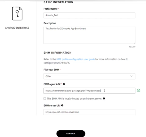 • EMM agent APK: Enter the Playstore link from where you can download the ZENworks APK. Enter the APK url value as https://play.google.com/managed/downloadManagingApp?identifier=zenworks