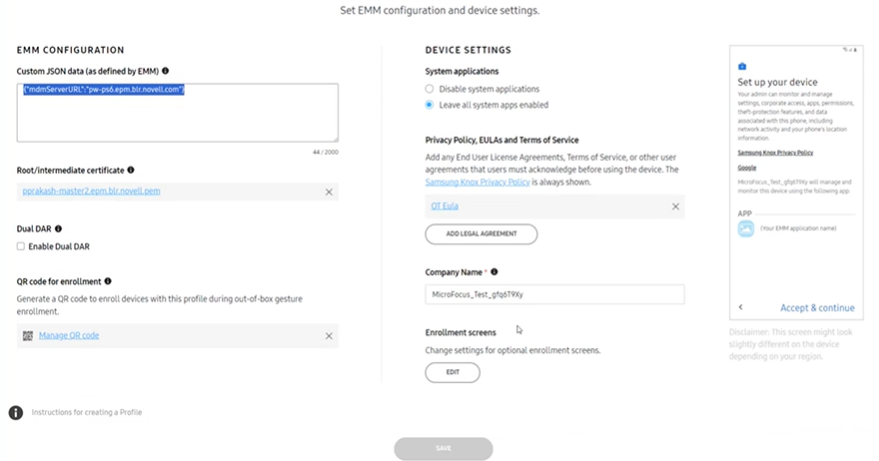 ZENworks provides you the option to enroll Samsung Knox devices into Mobile Device Management (MDM) solutions. This enrollment method enables administrators to set up Samsung devices right out of the box with a one-time configuration.