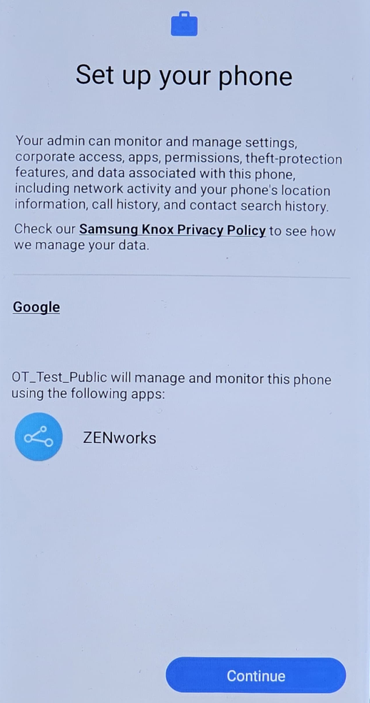 6. Follow the prompts appearing on the remaining screens to set up a work-managed device for Knox enrollment.