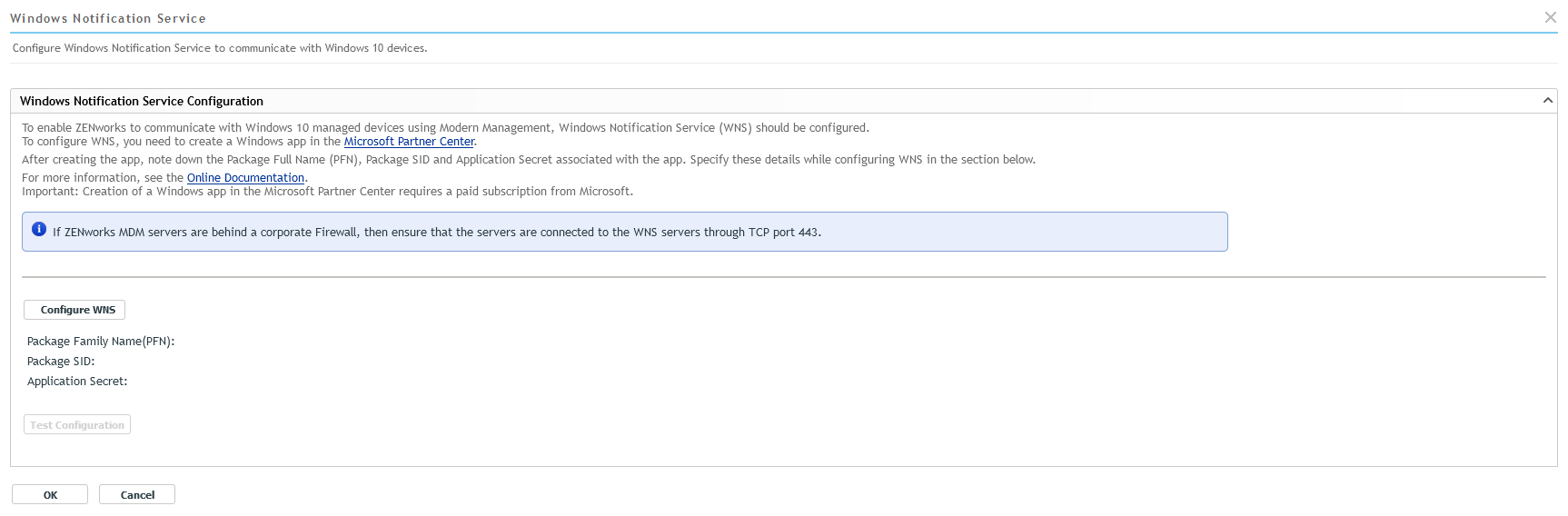 To enable ZENworks to send push notifications to Windows devices that are managed through Windows Modern Management, Windows Notification Service (WNS) should be configured.