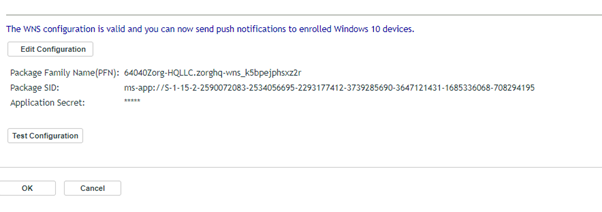 After clicking OK, Package SID and Application Secret are validated, and then ZENworks establishes a connection with WNS.