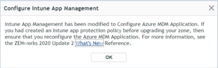 If any Intune App Management policies were created before upgrading to ZENworks 2020, then you can either delete the policies that you had created, or you can perform the steps in the Reconfiguring the Azure MDM Application after Upgrading the Zone section to retain them. If reconfiguration is not performed, then the existing policies might work, but any updates made to the existing policies might not be applied.