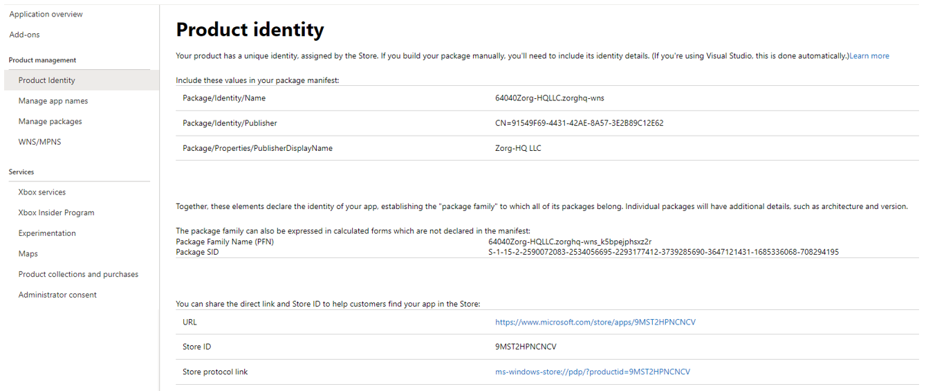 After creating the app, ensure that you have noted the following details to configure WNS:
