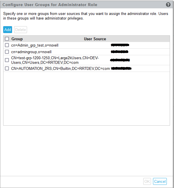 Add: Click Add to add groups from a configured User Source. These groups will be listed below after they are configured.