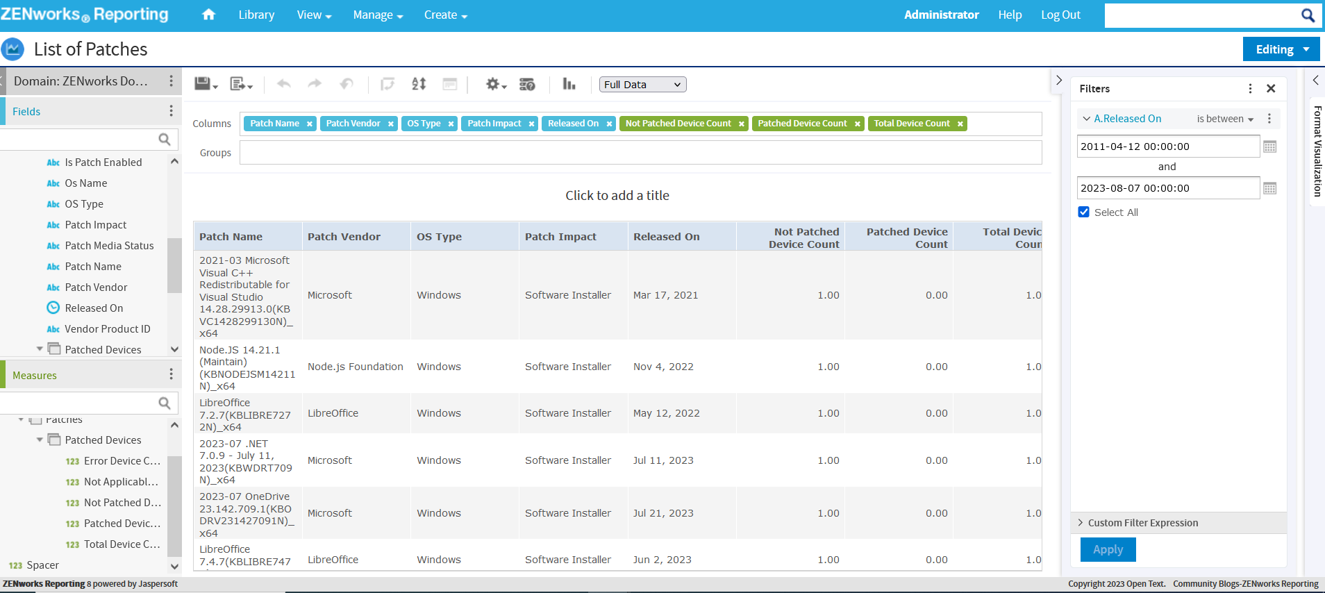 To view the list of patches with Time Range filter for released on parameter, add the following columns: