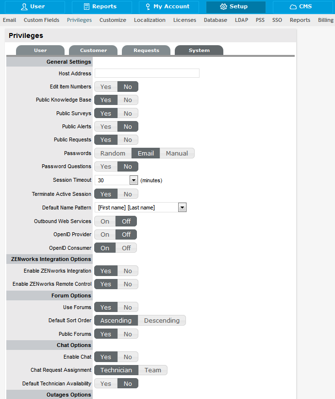Click Setup > Privileges > System.