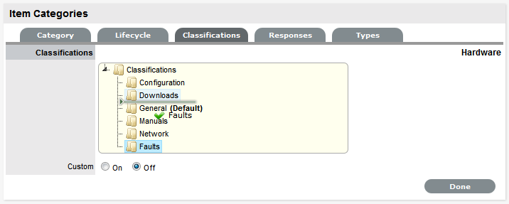 A list of Classifications used to define issues are created within this tab and used as the generic Classification for requests logged against Items that apply the Item Type Category being configured. The Classifications are also used by the system for proactive Incident analysis and Problem groups.