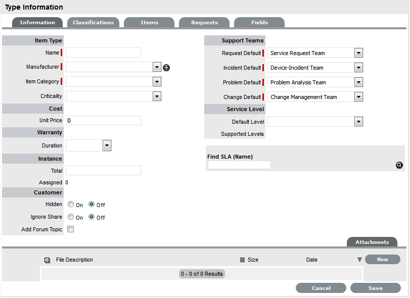 In this section, Item Types and their manufacturers can be created and edited. The Item Types default support Team is assigned here, as well as Criticality, service level and other default information.