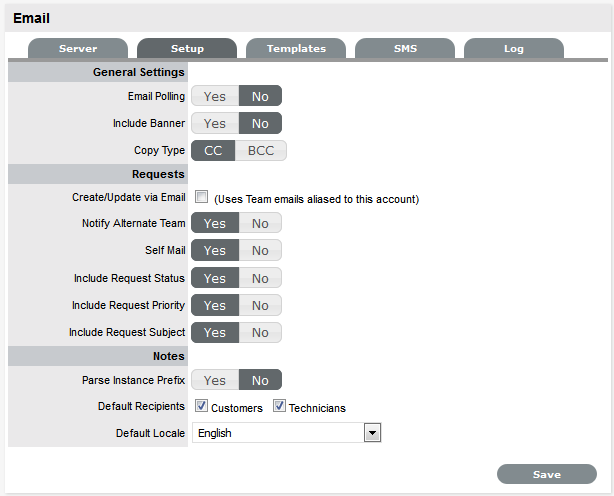 This step allows the system to manage requests via email. After you finish filling in the information in the Server and Setup tabs, the content for automated email sent by this system can be customized.
