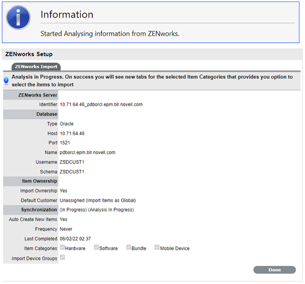 The System starts analyzing information from ZENworks datasource. This might take several minutes depending on size of datasource and network connection.