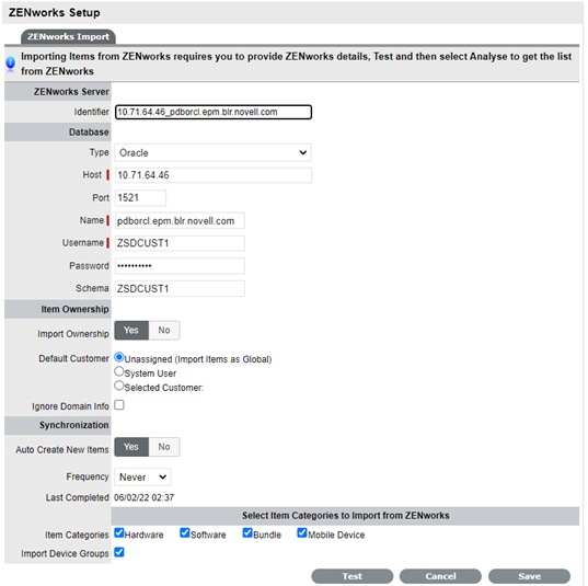 Within the ZENworks CMDB import screen, multiple asset management datasources can be synchronized with the service management system.