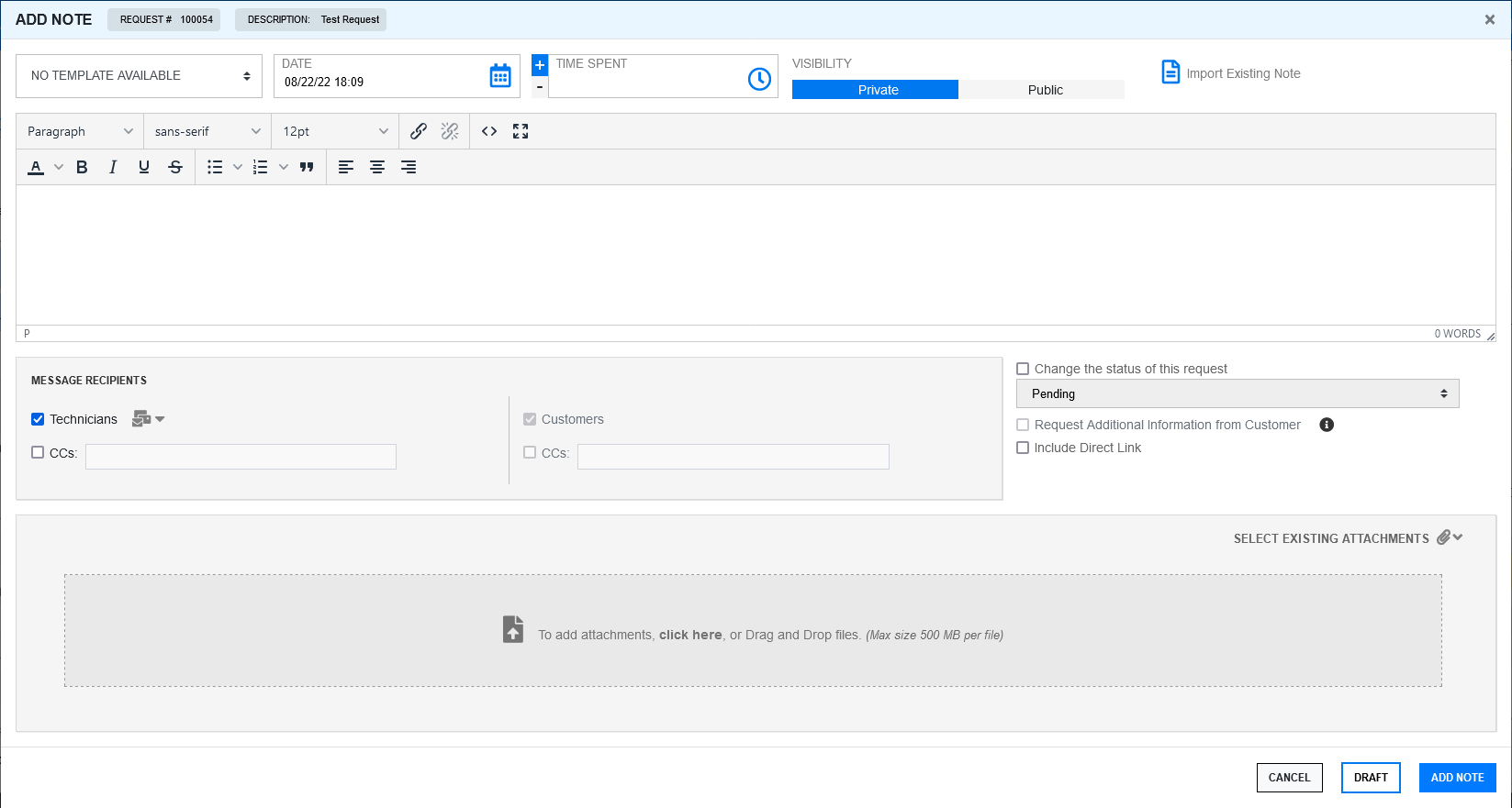 Click After clicking the icon, a pop-up is displayed. In the pop-up, you can select the options to include all notes or last note associated with this request, and to include Private Notes associated with this request. |