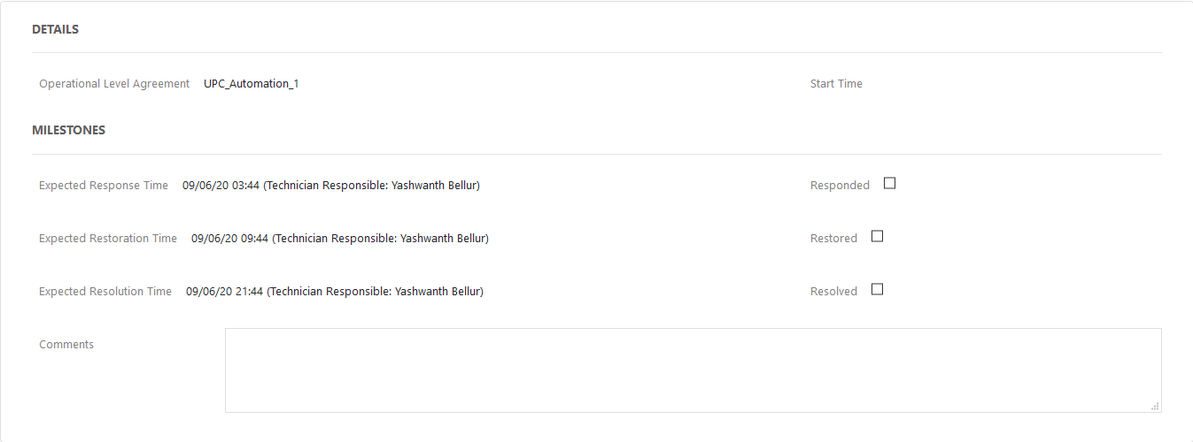 If the current Service Request Workflow State is assigned an Underpinning Contract or OLA, a table is displayed outlining the response, restoration and resolution milestones. When a milestone is met, the User is required to check the relevant checkbox. The application will automatically calculate the actual time accrued to achieve the milestone. The value displayed here is used for the Contract reports. |