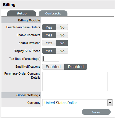 If Billing is to be used to manage Contracts, it is recommended that this be enabled before other configuration is set, to prevent system disruptions.