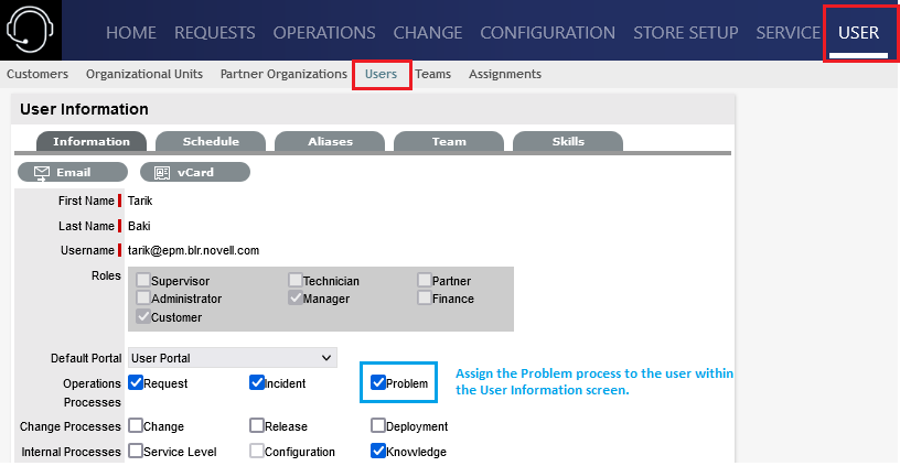 Assign the licensed access for Request Fulfilment, Incident and Problem Management. Assigning Processes to the User gives them access to support those Processes and enables them to be assigned as Team members for those Processes' Teams. See User Processes. |