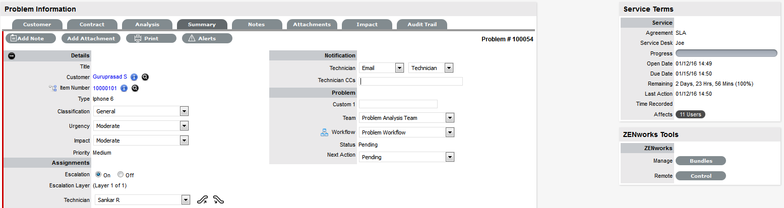 The Problem is automatically escalated according to the SLA assigned to the Problem and the triggers configured within the Priority of the SLA. An Incident is escalated if the assigned User exceeds the Escalation trigger point defined for the Response, Restoration or Resolution time of the assigned SLA, when the assigned Workflow State is an SLA Active State. Or, it can be manually escalated by a User, if required.