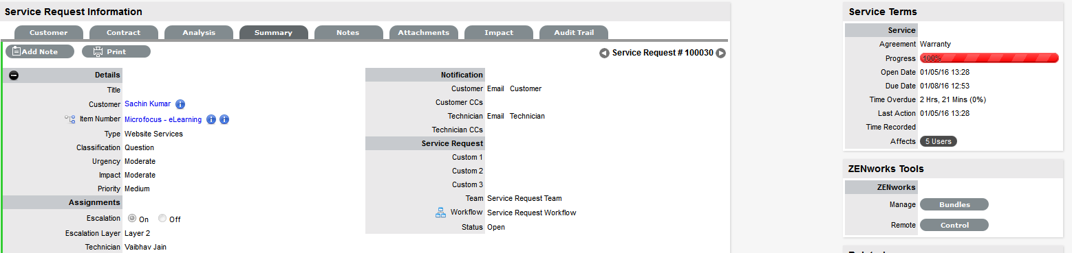 Within the Summary screen, the Status Due field is visible when a Workflow Status is monitored by an OLA. The time, date and percentage remaining information displayed is calculated using the OLA's Target Resolution time.