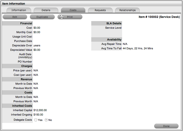 The Costs Tab of a Service Item includes information related to the financial and contractual details associated with the Item. The information more specifically related to the Service Item is recorded in the Charges and Revenue fields, as this information allows service and support organizations to calculate the costs of offering a service and if appropriate, recover the costs from the relevant parties.