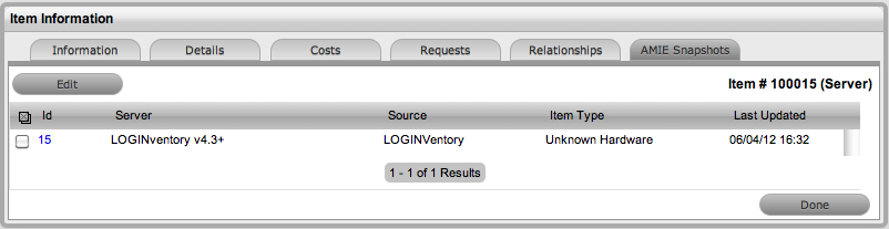Use the Merge button when multiple Snapshots of an Item are to be stored against a single Item record in the CMDB. Select the related Snapshots by checking the relevant boxes next to the Id Number, and click the Merge button.
