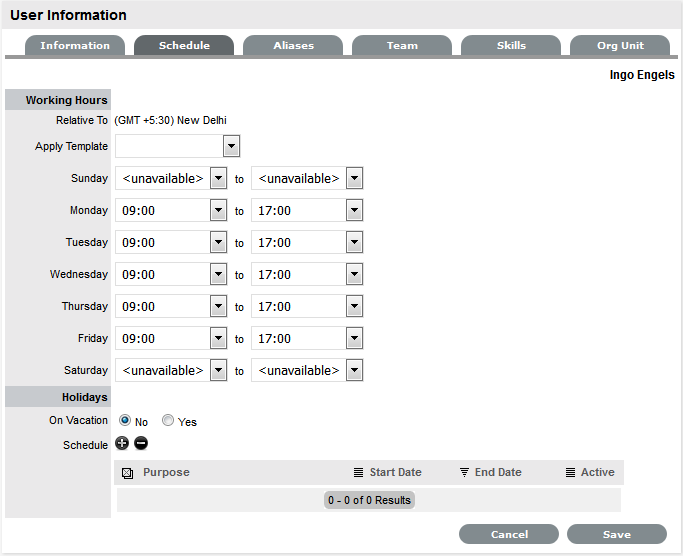 By default the Schedule tab includes the On Vacation option, which can be set to Yes when the User takes leave. The system will automatically reassign the User's active requests, if the Vacation Reassign option has been enabled in the Admin>Setup>Privileges>User tab. If this option has not been enabled, a Supervisor User will need to manually reassign the requests, if required.