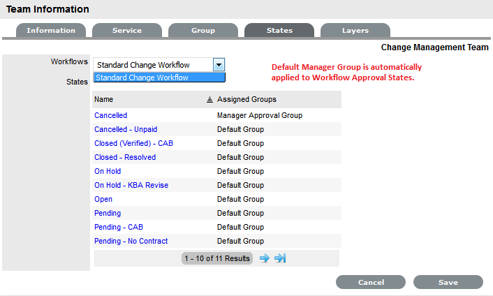 For a Manager User to be allocated the privilege of approving a Change or Service Request they must be assigned to a Change or Service Request Team and an Approval State of the relevant Change or Service Request Workflow. Change Workflows must include Approval States (i.e., States where activities are accepted or rejected) before the option to assign a Manager to a Change Team becomes available. See: Service or Change Request Workflows for more information.