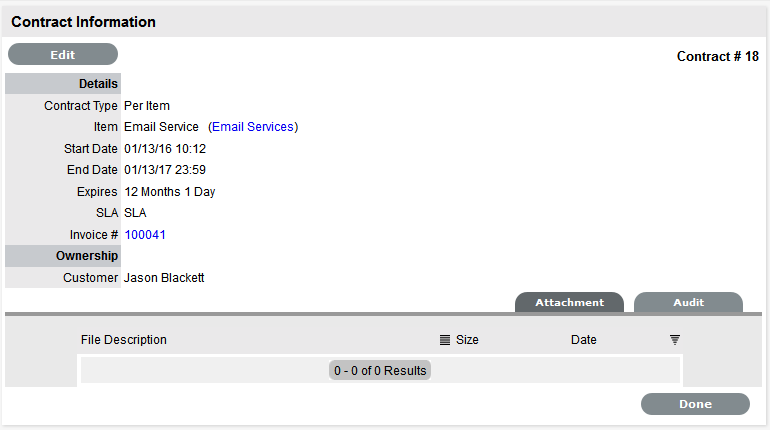 An Item, Customer and Organizational Unit can only have one active contract in place at a time but multiple contracts can be queued by assigning a Start Date that falls after an existing Contract's end date. Queued Contracts are visible within the Item, Customer or Org Unit's Contract tab identified by the contract number generated at the point of creation, if Invoicing is not enabled in the system. If Invoicing is enabled in the system and an SLA cost is associated with the contract, a contract number is generated when the invoice payment is processed by a Finance User.