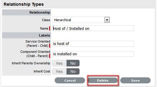Enter a Name that reflects the nature of the relationship for both Component or Service views. For example, component view Name = Deployed in/Host of.