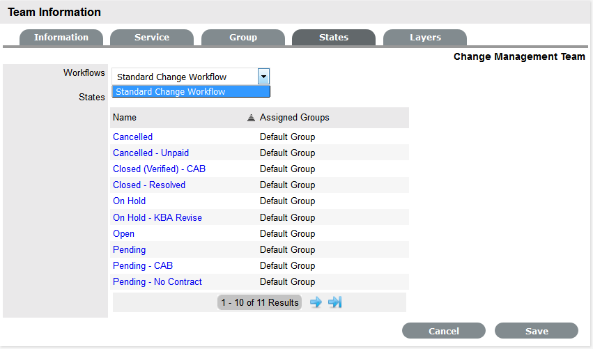 The system moves to the States tab to display the list of Workflows associated with the Team, and the list of States included in the selected Workflow.
