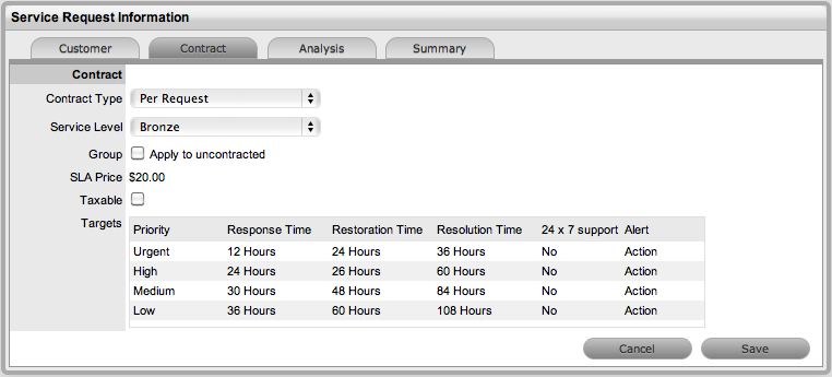 Contracts can be applied to all requests within an Incident Group when a Per Request contract is created within the Contract tab of a grouped request. The following options are available: