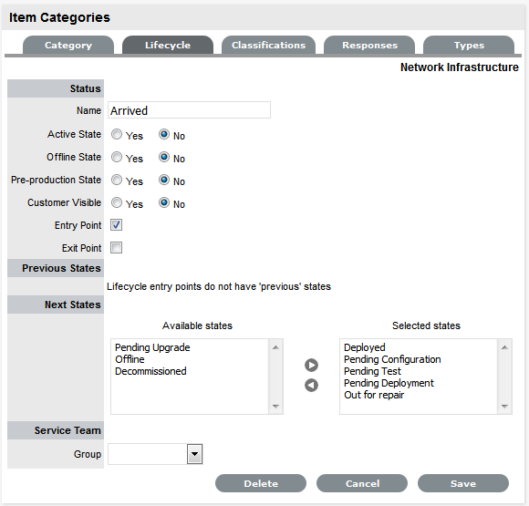 In this example the Item Category Hardware has a Lifecycle State of Arrived. This State is inactive and an entry point. Items assigned this State would not be visible on the Customer Portal.