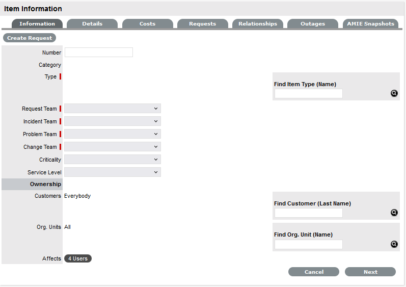 If Billing is enabled an owner must be assigned to the Item. The owner can be either a Customer or an Org Unit, but only Org Units that have a Primary Contact, will be displayed in the Org Unit Search list. (See: Primary Contact.)