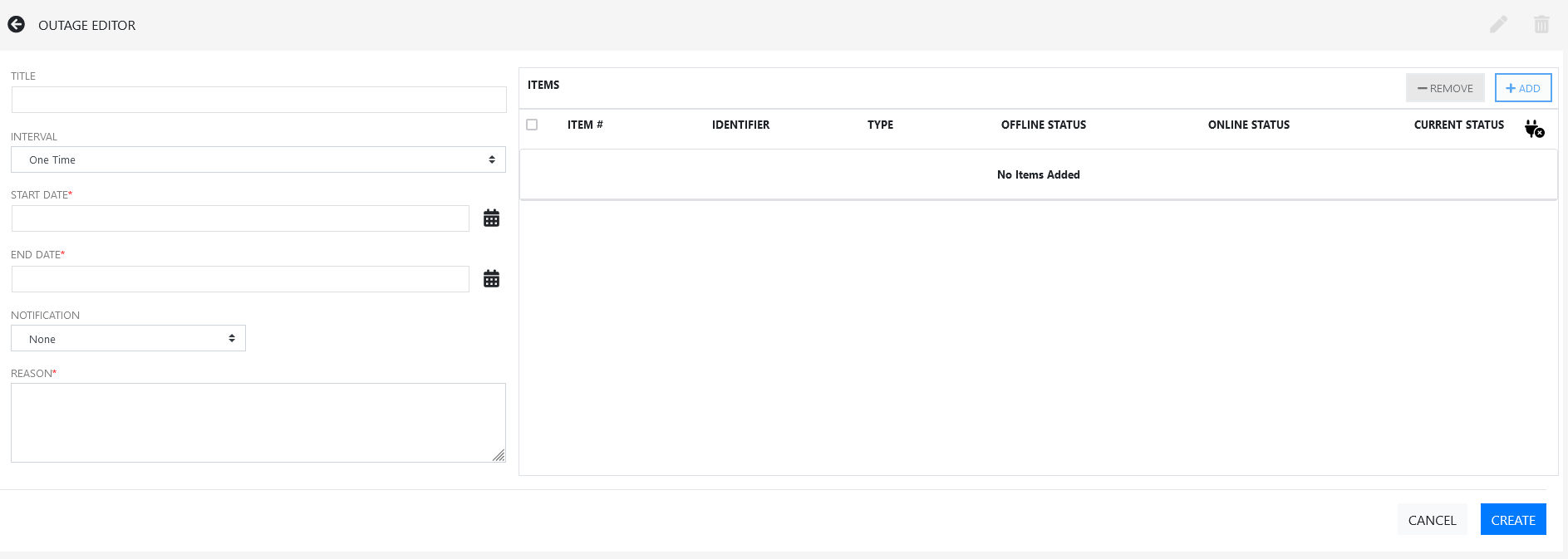 Planned outages can be created for an Item under the Outages tab. This is a period of time an Item will not be available for a Customer's use.