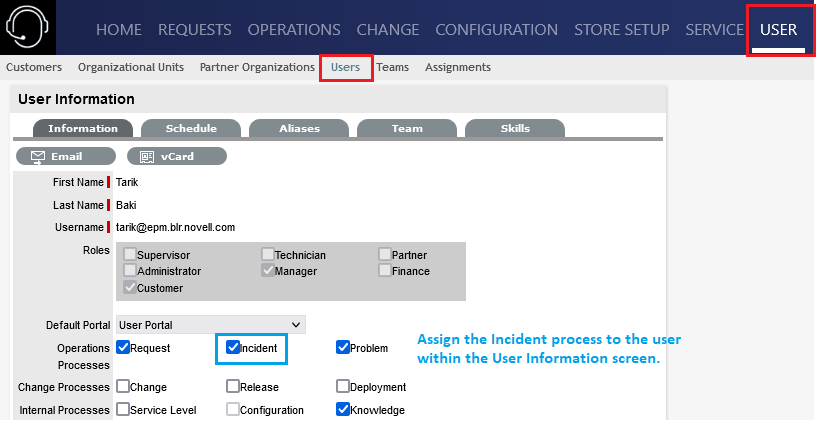 Assign the Incident Management Process to the relevant Users within the User Information screen under the User>Users tab. (See:Create a User.)