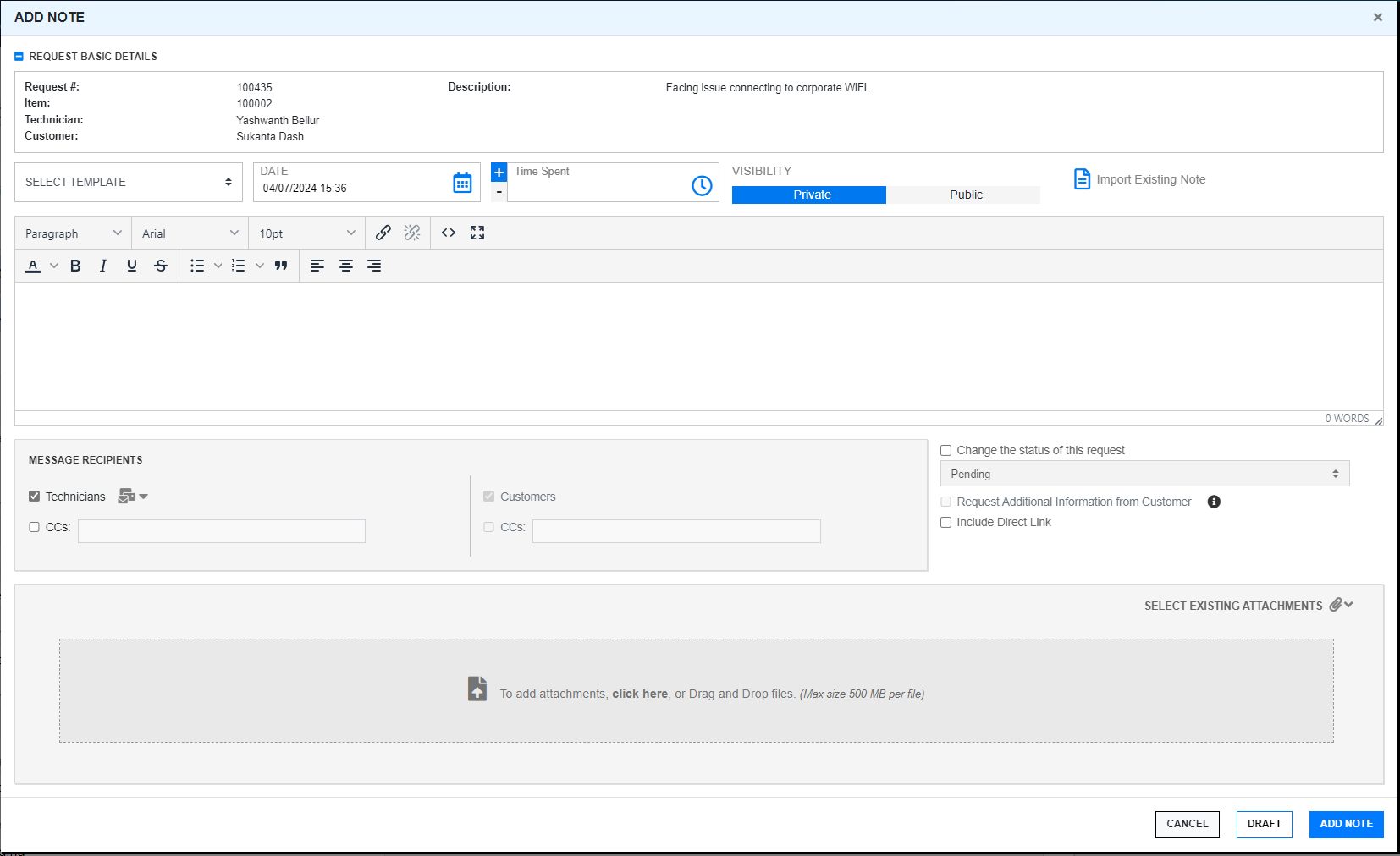 Click After clicking the icon, a pop-up is displayed. In the pop-up, you can select the options to include all notes or last note associated with this request, and to include Private Notes associated with this request. |