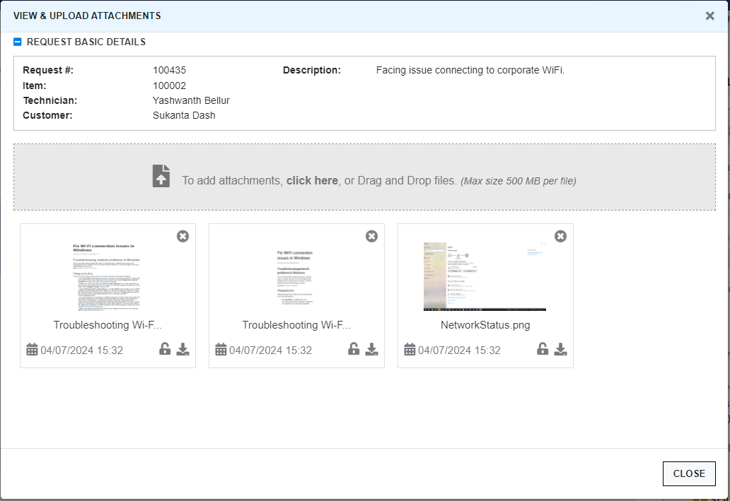 Attachments:Displays the number of attachments associated with this request. To view or add attachments, click the Attachment link. To add an attachment, you can either click or drag and drop the file in the field. ![]() |