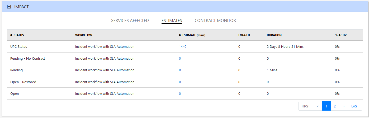 The Impact tab provides the capability to measure the progress of a Service Request relative to agreed Service Level targets and Workflow time estimates. It also includes a quick reference for identifying other Services or Items affected by the Request. This tab displays a summary of the following: