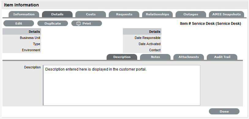 Content entered in the Description field is made available on the Customer Portal in the expanded information window for an Item. For Service Items, where a description of the Service may be required within the Customer Portal, details about the Service can be completed within the Item Description field. The Item and Service information can be expanded by completing Item attribute fields that are marked as Customer Visible and therefore displayed in the Customer Portal.
