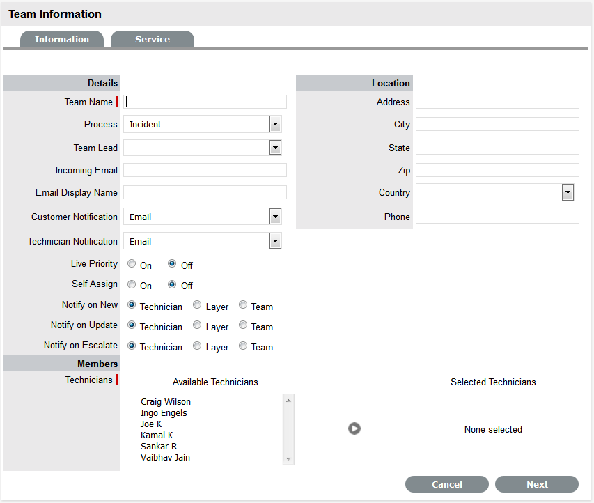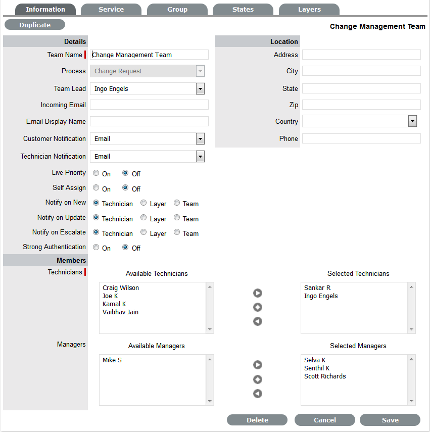 For example, a Frontline Support template may be created, where a User is assigned to Layer 1 of an Incident Team and a Work Group of a Service Request Team. They may also be assigned to an Update Customer Group within a Change Management Team. This template could then be easily applied to all Users created directly in the system, within the User Information screen. Or, if the User was created using an authentication server, the template could be applied within the Team tab of the User Information screen.