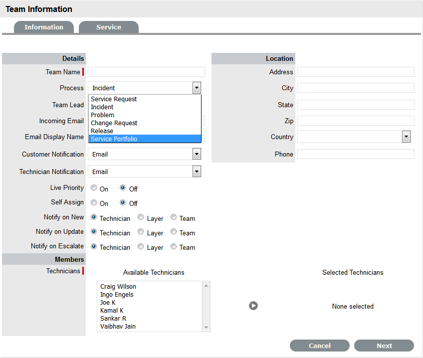 NOTE:When creating the Teams, it is suggested that the Group names reflect the stage of the Service Lifecycle, for instance Service Design, Service Implementation, Service Operation, Service Quality Control and Catalog Management.
