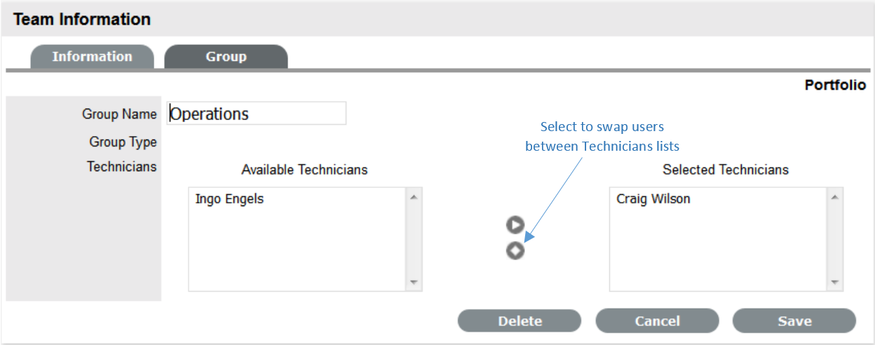The Group Name can be edited and the Available Technicians and Selected Technicians fields are now accessible. As a Deployment Group Type, this group of Users will be available for assignment for Deployment Tasks created as part of a Release Workflow.
