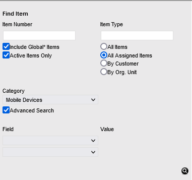 For the Find Customer, a custom field list will appear. For Find Item, an Item Category drop-down list is displayed.