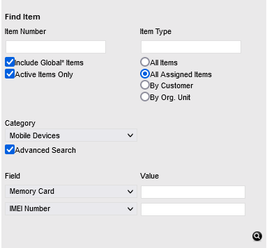 To search for a Customer or an Item based on custom field information, use the Advanced Search option. The Advanced Search enables the User to search on Customer or Item custom fields, if they have been enabled.
