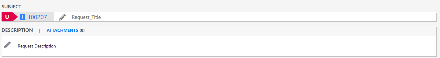Displays the priority of the request, Request Priority, Request Number and Request Title. NOTE:The priority is always derived and cannot be added manually selected. The available priorities are U-Urgent (highlighted in Red), H-High (highlighted in Orange), M-Medium ((highlighted in Yellow) and L-Low (highlighted in Green).