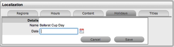 The Date field for rescheduling the Holiday is displayed. This allows the Administrator to adjust the day the public holiday is observed, and caters for instances where the public holiday falls on the weekend but is observed on either the Monday or Friday. The Administrator must account for this adjustment on an annual basis for all relevant holidays.