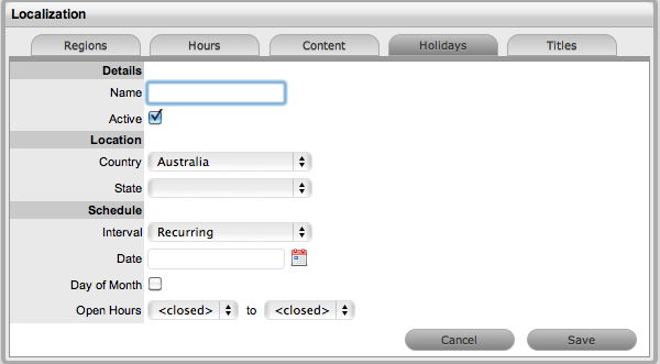 By default the system includes the national public holidays for a number of countries that can be accessed by changing the filter view of the Holidays list. This list can be expanded to include any country, including relevant holidays for its different states or provinces.