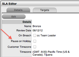 For Public Holidays to be considered in relation to an SLA, the Pause on Holiday option needs to be enabled for the specific SLA. This option is only visible within the SLA Editor screen after the Administrator has activated the Public Holidays option within the Setup>Privileges>User tab.