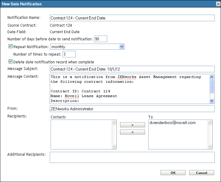 The Date Notification check box is enabled. In addition, a date notification record is added to the Date Notifications list ( > > ). For information about the list, see Section 24.4, Viewing the Date Notifications List.