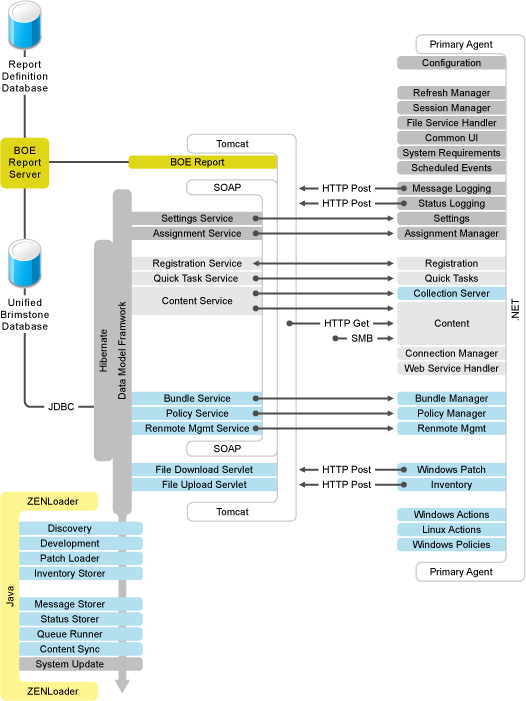 The following diagram is a visual representation of how the individual components of both the ZENworks Server and the ZENworks Adaptive Agent interact with each other at a component-by-component level, and where the processes are initiated. This is a full view of the ZENworks Configuration Management architecture.