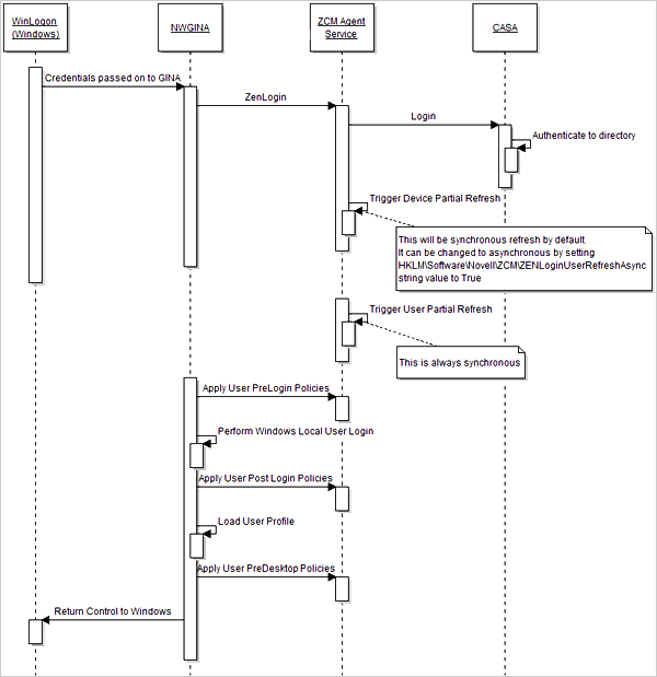 The ZENworks Configuration Management Login flow of events is depicted in the following diagram: