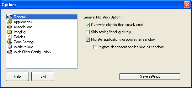 You can use the Options windows of the Migration utility to configure certain options before migrating objects to ZENworks Configuration Management To launch the Options window, click